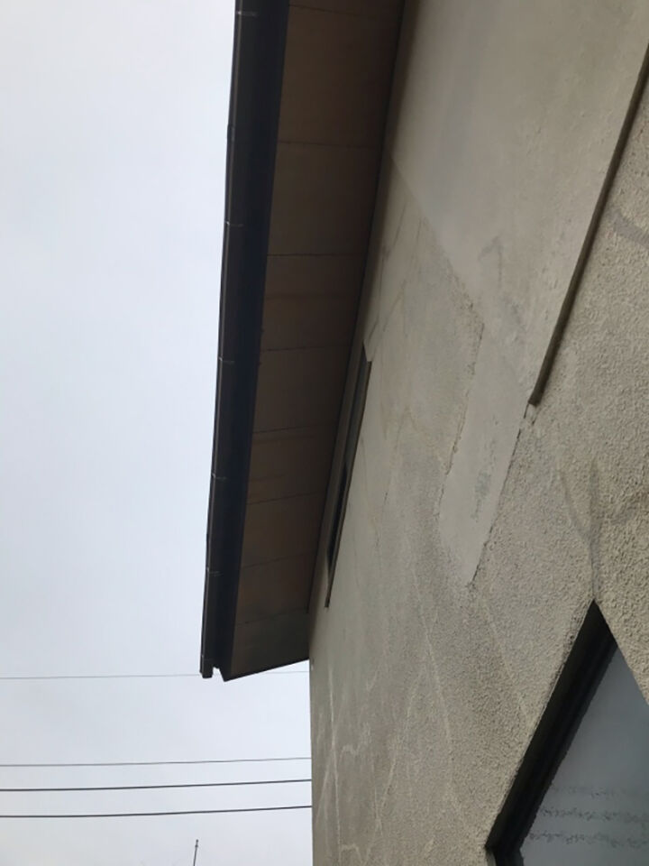 軒天の劣化と外壁の浮きが目立ちます。