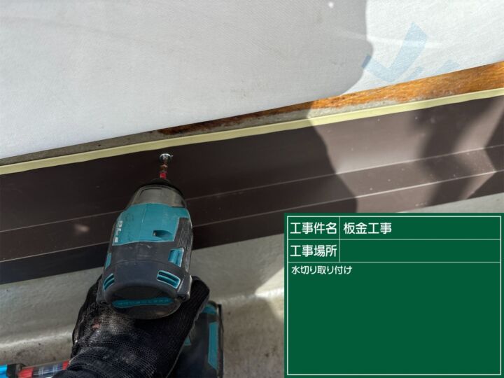 防水シートをめくって、ビスで水切りを止めていきました‼️