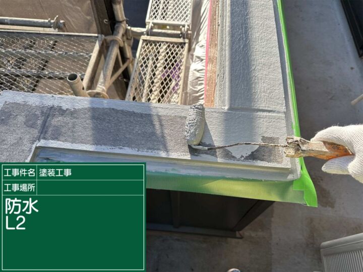 どんな下地でも防水塗装することができる高性能な塗料で、今回はベランダ手すりを取り付ける笠木部分に塗って雨水が外壁内部に侵入しないようにしました☔