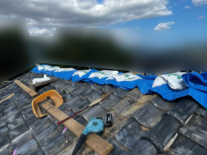 棟瓦が無いと急な雨でまた雨漏りが起きてしまうので、翌日に工事を持ち越すときはブルーシートで覆って急な雨に備えます☔