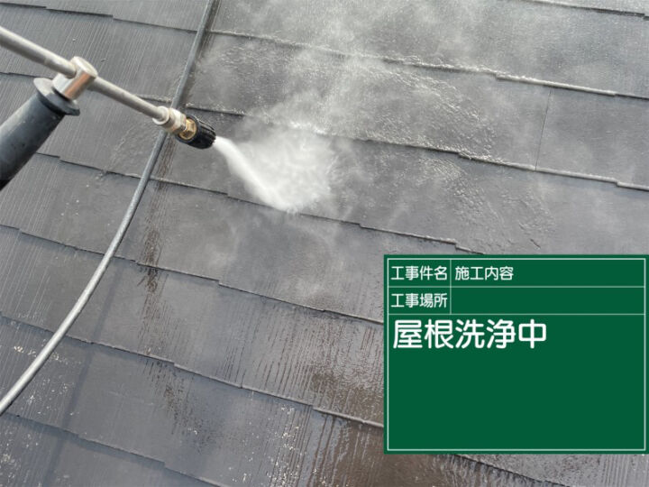 屋根から順番に、高圧洗浄機を使用して、汚れを落としていきます。