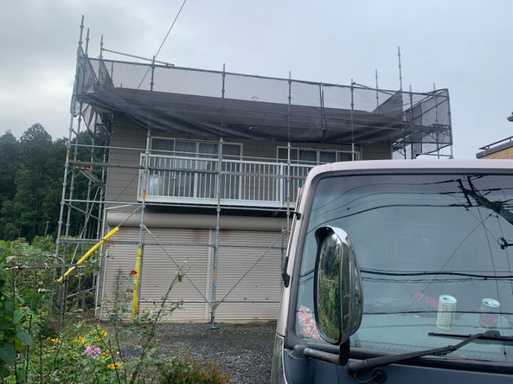 土浦市の雨漏り現場。工事に先立ち、足場の設置をおこないます。