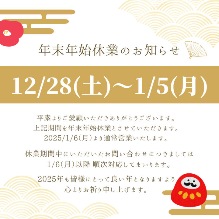 【年末年始休業のお知らせ】2024/12/28(土)~2025/1/5(日)