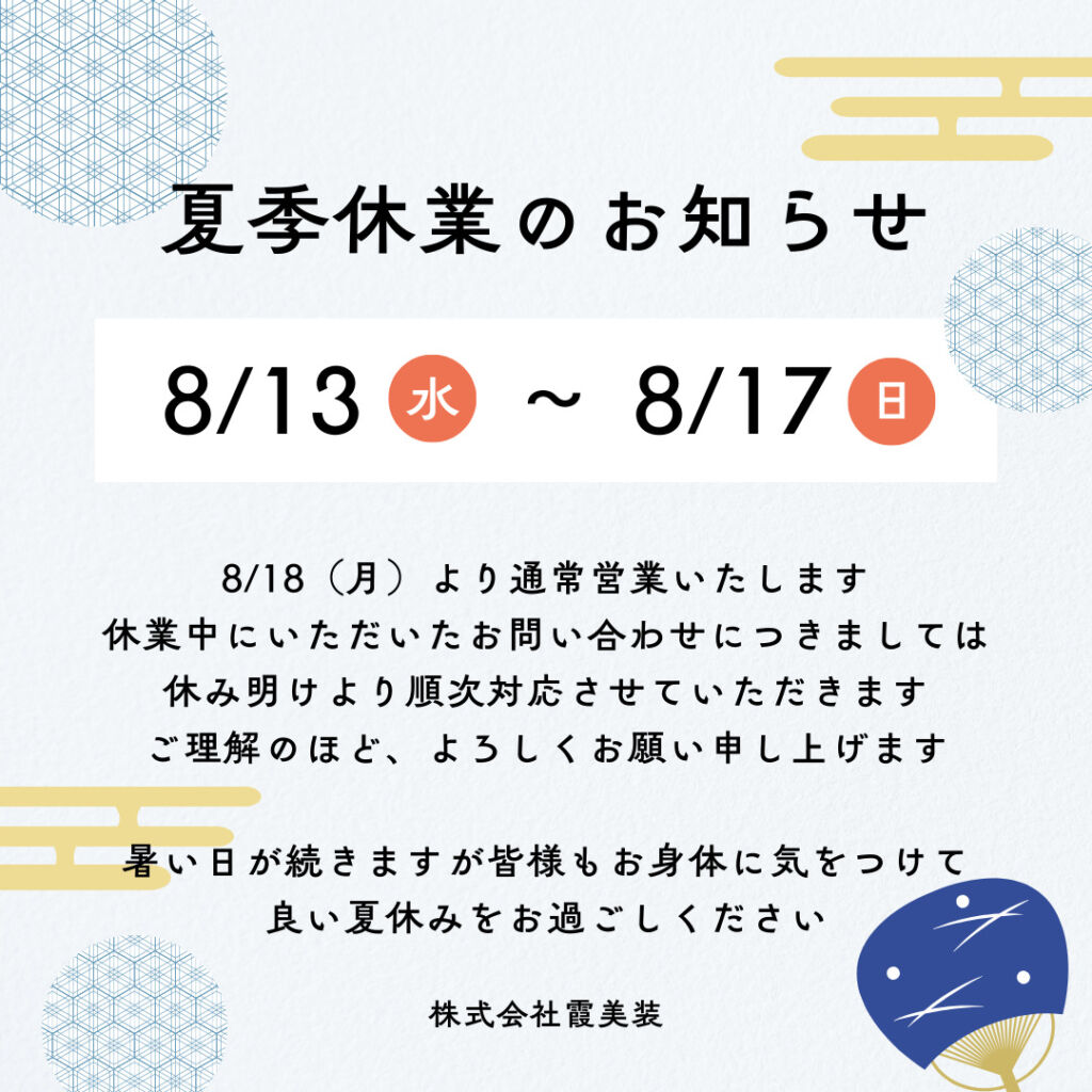 霞美装は2025/8/13-17までカレンダー通り休業いたします。メールや公式LINEでのお問い合わせは随時受付しております。返信は営業日以降順次対応してまいりますのでご了承ください。