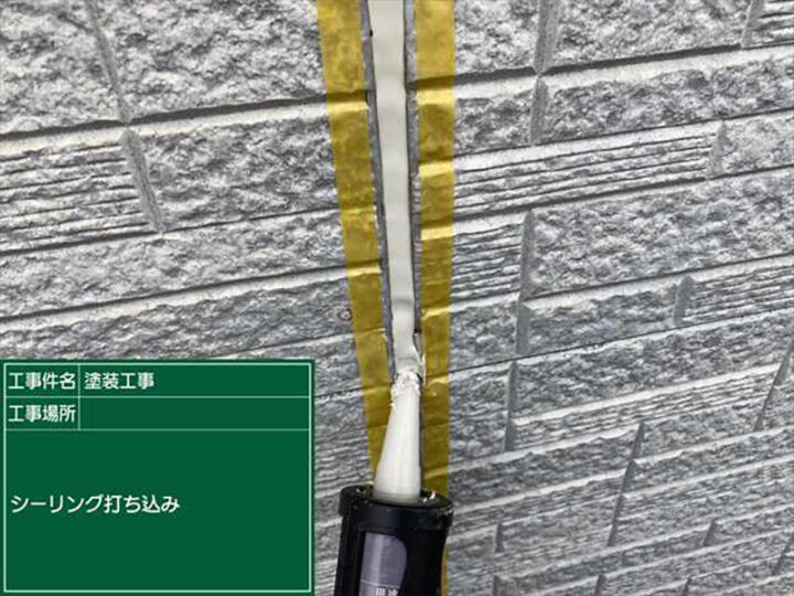 前もって撤去したサイディングのシーリング部分にマスキングテープを貼り、プライマーを塗布したらシーリングを打っていきます。