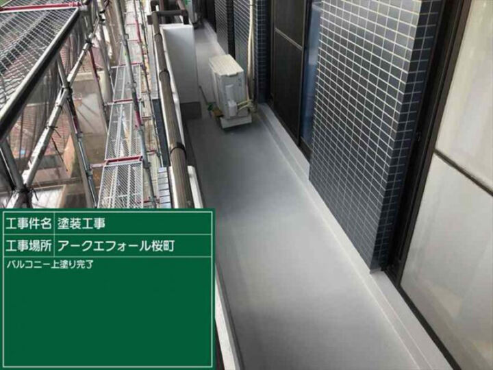 土浦市マンションのバルコニー防水、左の写真が防水3回目の様子です。