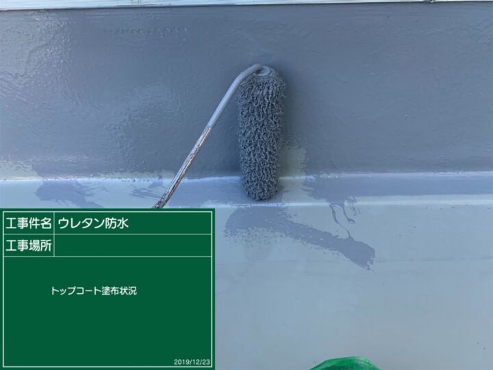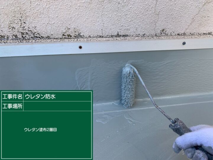 柔らかいシート防水の上に固いFRP防水をおこなうと不具合が起きる可能性があるため、ウレタン防水を施していきます。