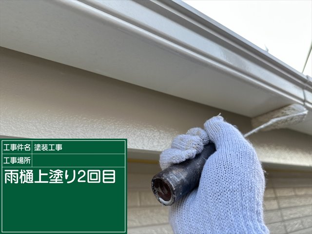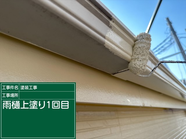 デコボコした形状の雨樋を防カビ防藻性能のある塗料で綺麗に塗装していきます。