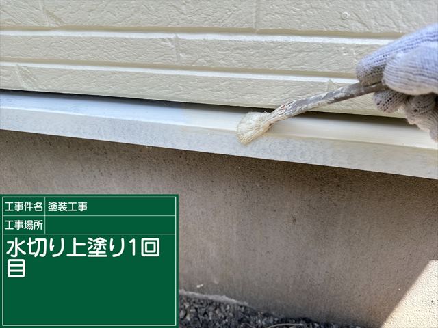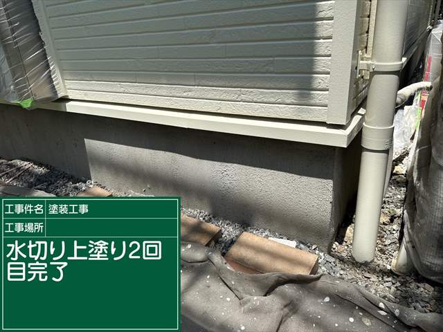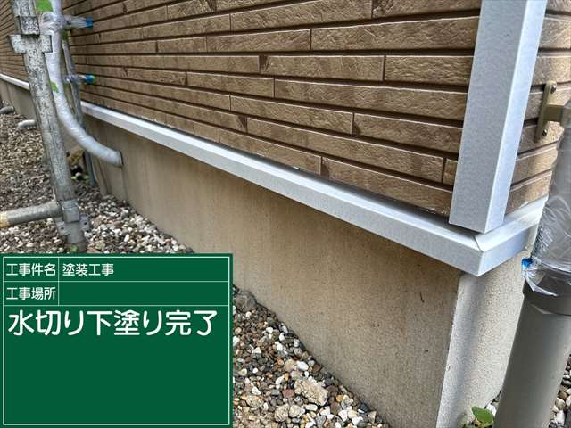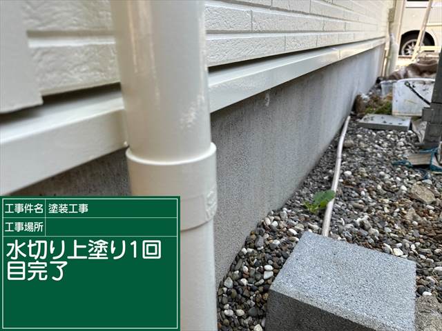 石岡市の外壁塗装現場でおこなった水切りの上塗り1回目が完了です。