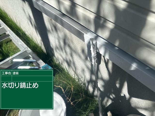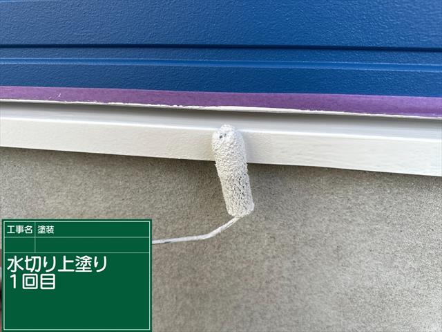 石岡市の外壁塗装現場、水切り塗装の下塗りをおこないます。