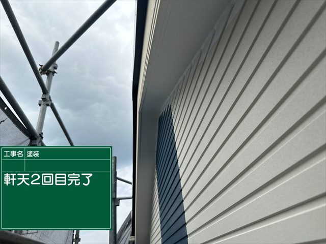 石岡市の屋根塗装現場でおこなった軒天塗装、2回目の塗装が完了しました。