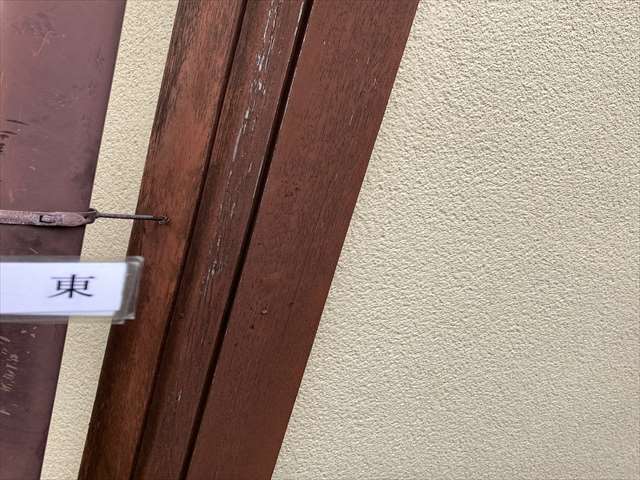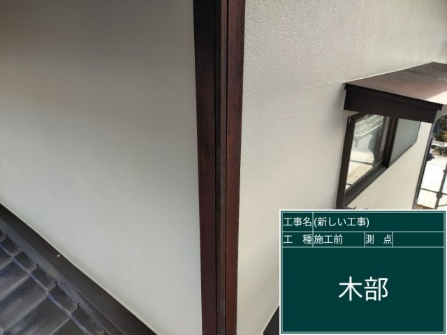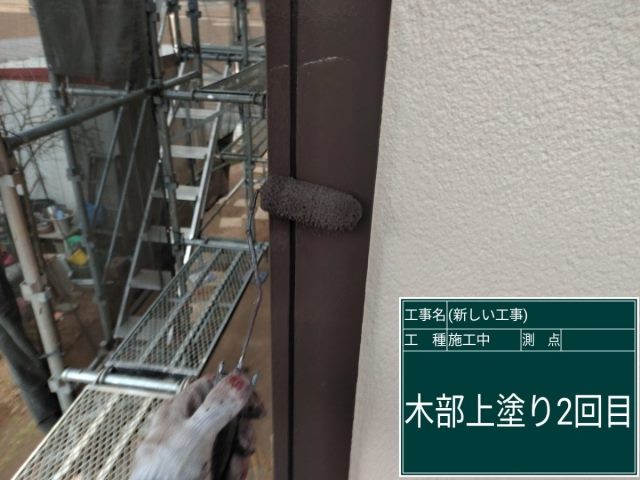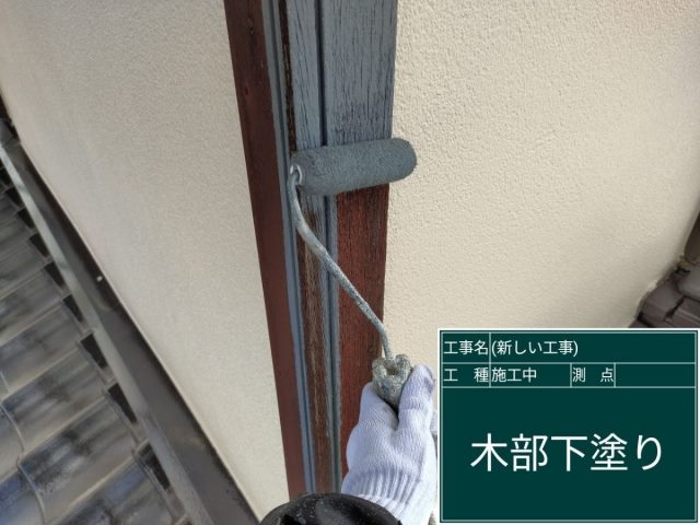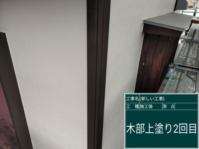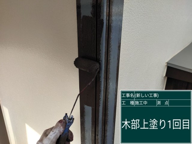 石岡市、モルタル外壁出隅の木部塗装、上塗り1回目です。