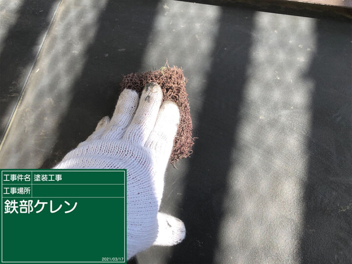 ケレンたわし等を使用して、長年蓄積された汚れやサビ、古い塗膜等をしっかりと擦り落としていきます。さらに細かなキズを付けることにより、新しく塗る塗料との密着性を高めていきます。