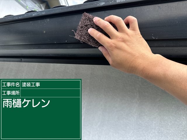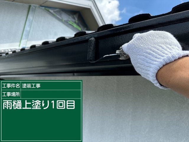 屋根外壁塗装現場の雨樋塗装の様子です。