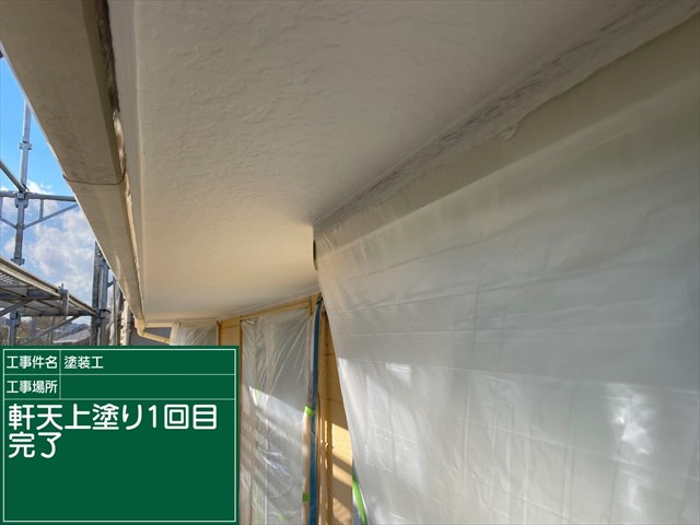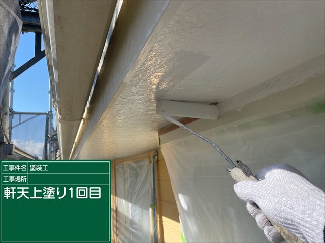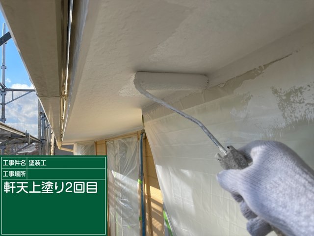 かすみがうら市現地の軒天塗装、上塗り2回目です。