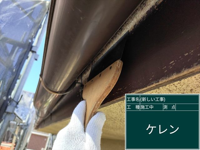 地ベラと呼ばれるヘラは、写真のような横樋と破風板の隙間でも入り込み、古い塗膜を落とすことが出来ます。
