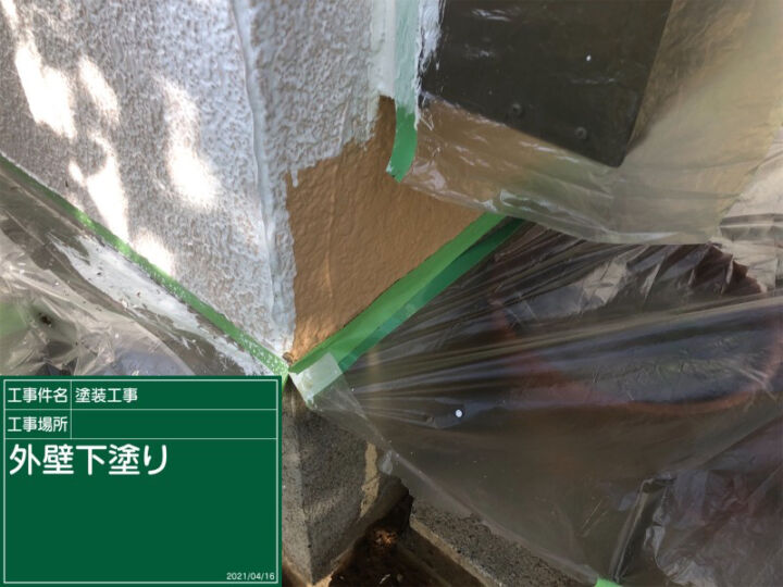 モルタル外壁塗装、外壁の下塗りが完了しました。