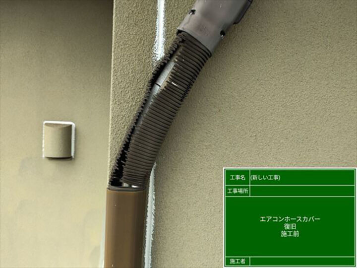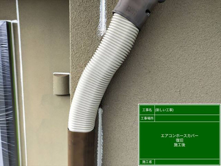 外壁の塗装まえに、エアコンのホースのカバーの復旧をおこないました。