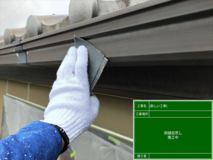 右の写真は、ケレン専用の器具を使用し、雨樋に塗料が密着しやすい状態にしているところです。