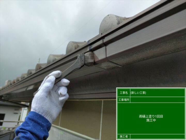 ケレン作業が終わり、密着性の高まった雨樋に塗料を塗っていきます。