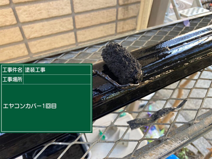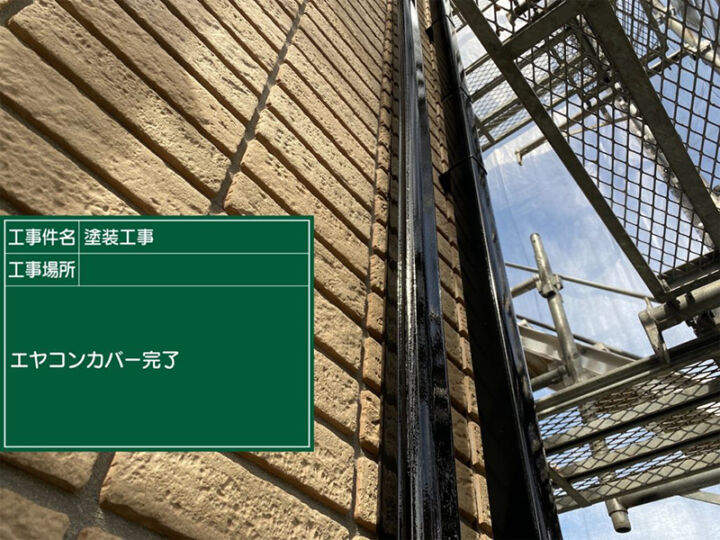 外壁塗装に伴うエアコンダクトカバー塗装、1回目の上塗りが完了しました。