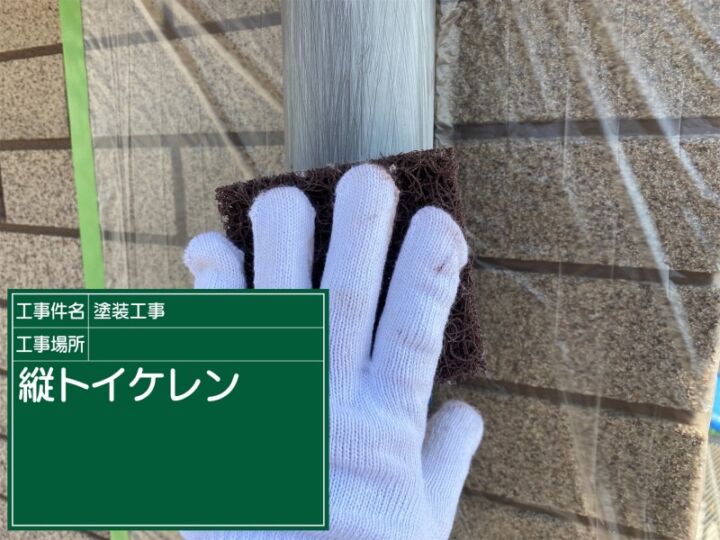 外壁塗装が完了しているため、汚れが付着しないようにしっかり養生して縦樋を塗っていきます。