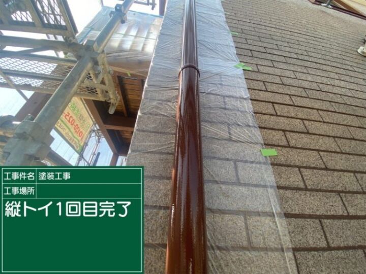 土浦市の塗装現場、雨樋1回目の塗装が完了しました。