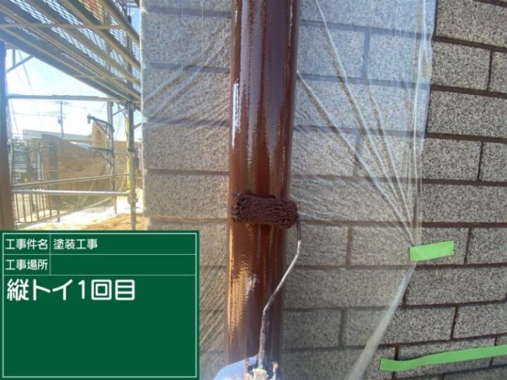 土浦市の塗装現場、縦樋1回目の塗装です。