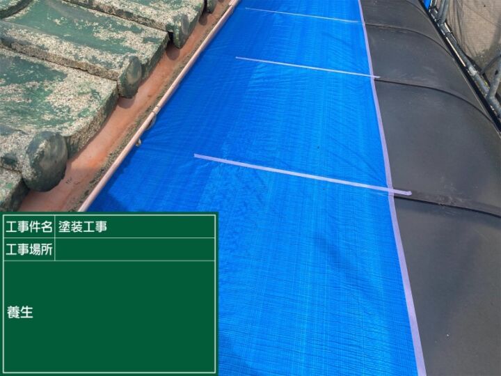 ブルーシートを敷いて、塗料が飛散しても汚れないようにしていきました。