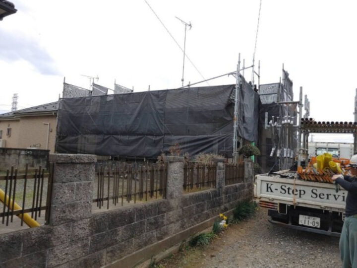 最後に、塗料の飛散防止ネットでおおって足場設置は完了です!