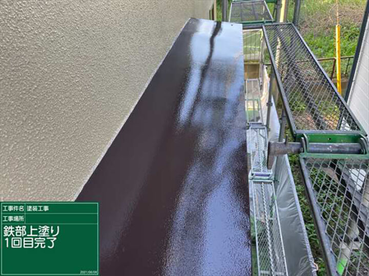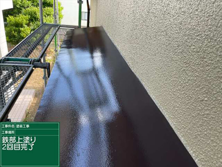 2回塗り重ねることで塗膜の厚みが増し、その分丈夫な塗膜に仕上がります。2回目の上塗りが完了した写真では、1回目の上塗り完了後よりもツヤがでていますね。