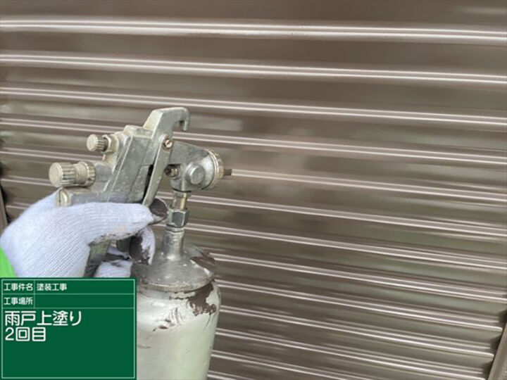 雨戸のように凹凸があるところの塗装にはスプレーガンが有効です。スプレーガンは短時間で施工ができ、凹凸にも均一に塗料を吹き付けることができます。