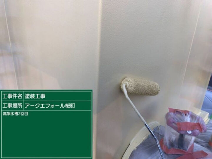土浦市マンションの高架水槽塗装、上塗り塗装(仕上げ)の様子です。