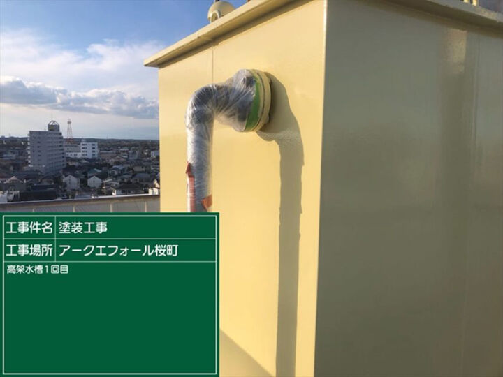土浦市でおこなったマンション塗装、高架水槽の塗装をしていきます。