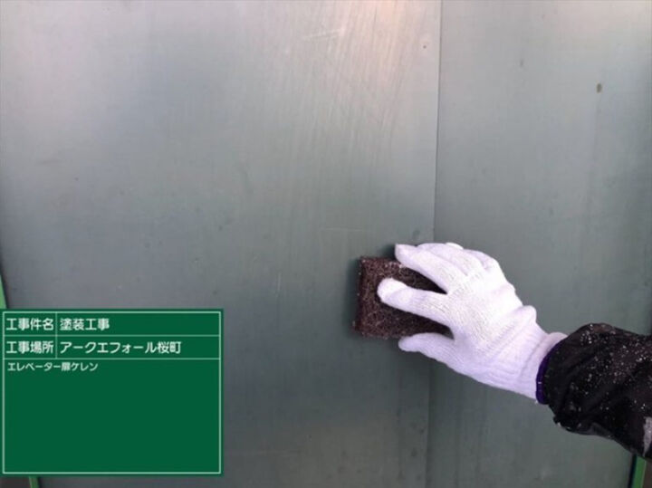 土浦市マンション、エレベータードアの塗装をの様子です。