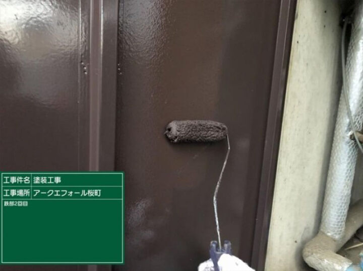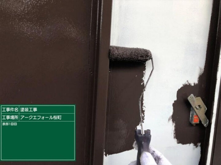 土浦市のマンション、設備点検用ドアの上塗り塗装2回目(仕上げ)の様子です。