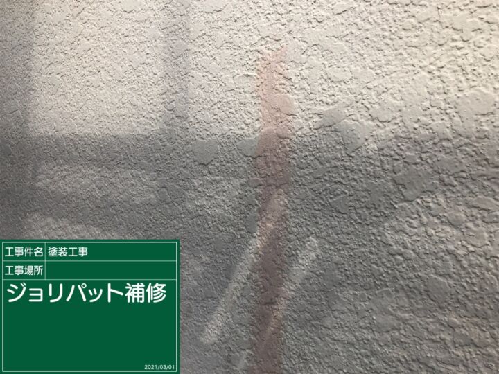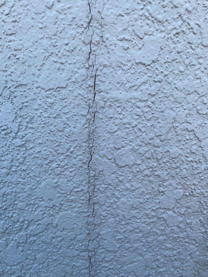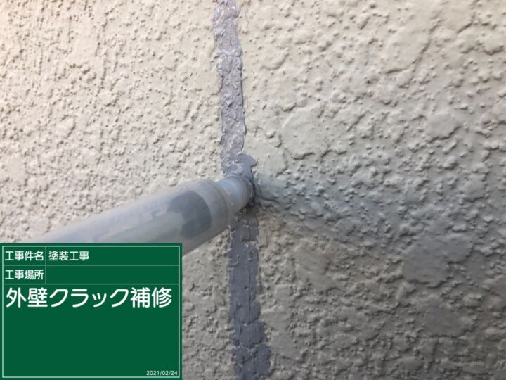 外壁塗装前に、クラック(ひび割れ)の補修を行います。スムースエポという弾性エポキシ樹脂の補修剤を注入し、表面を均します。