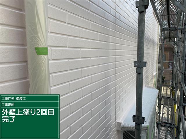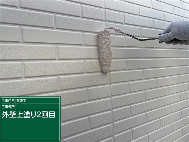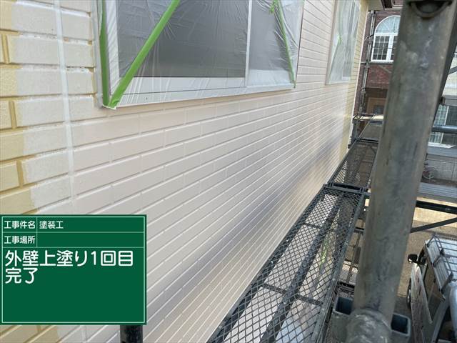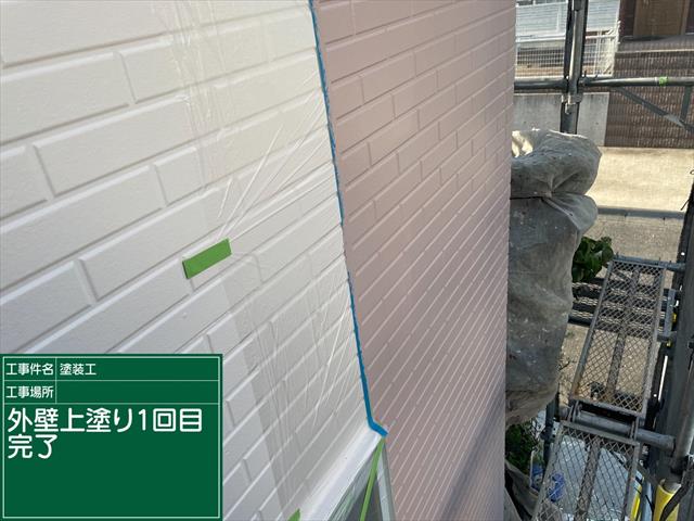 石岡市外壁塗装。アイシーピンクの上塗り一回目。他の色と対比すると白にみえますね。