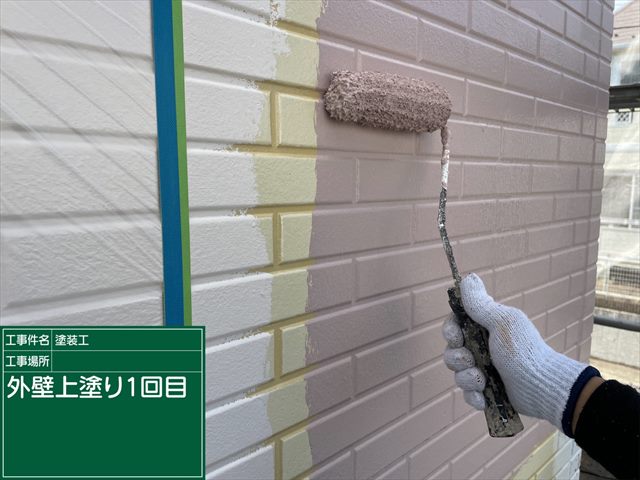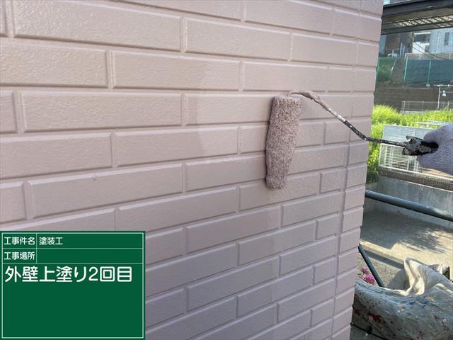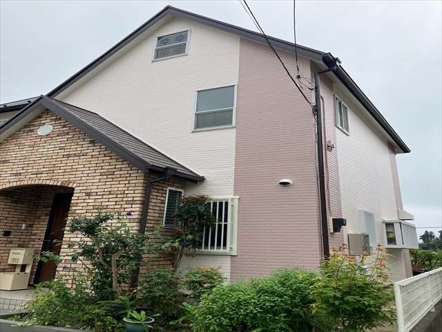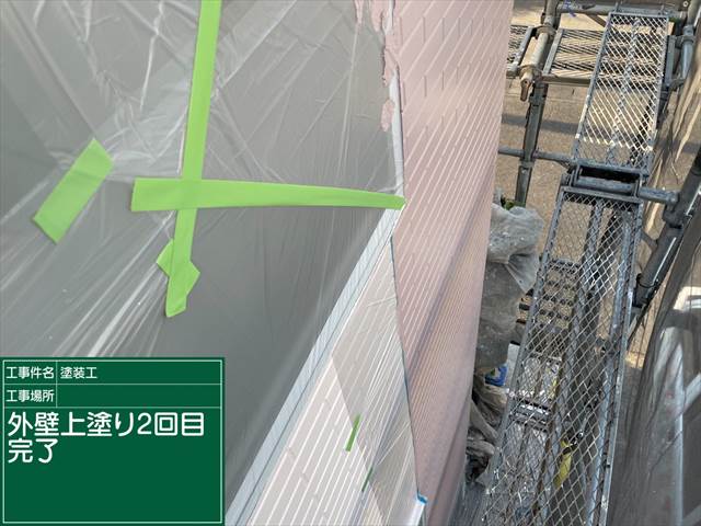 石岡市の外壁塗装、アイシーピンクとオールドローズの上塗り2回め。