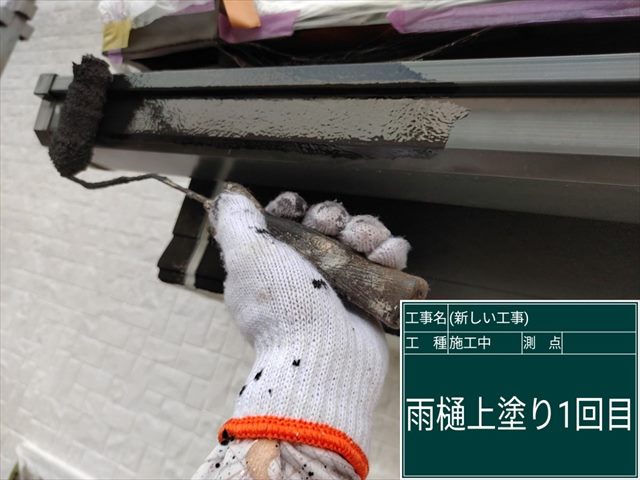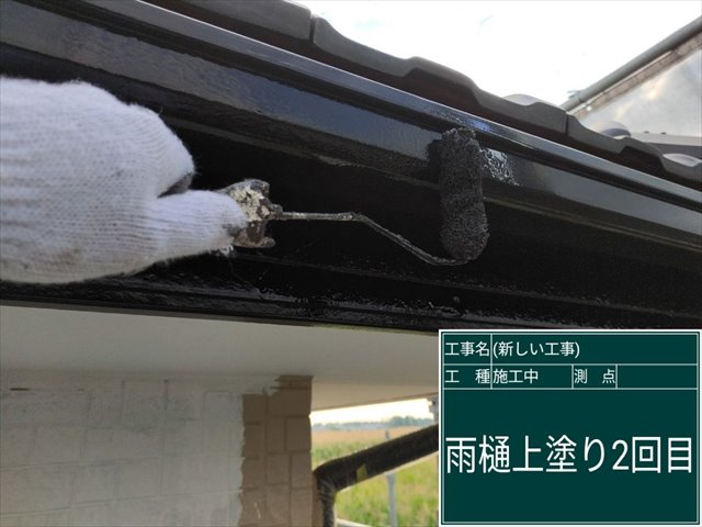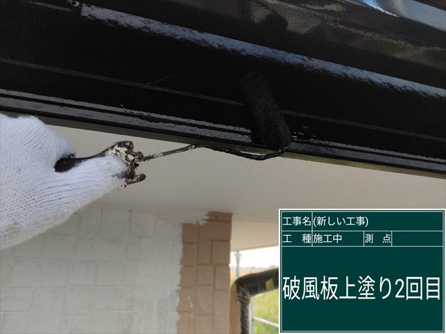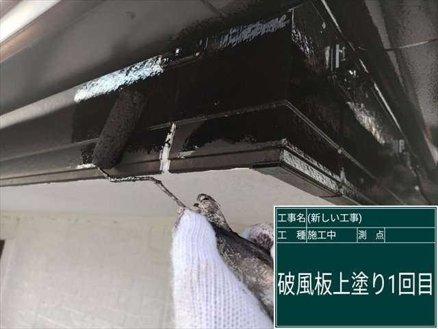 石岡市現場、破風板と雨樋の塗装の様子です。