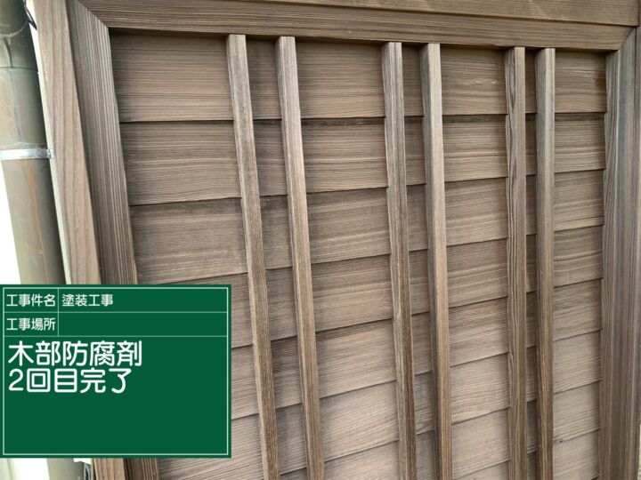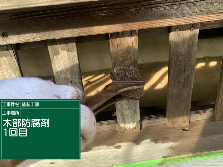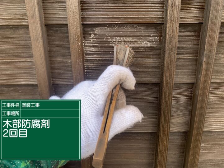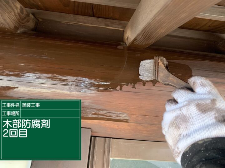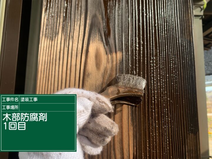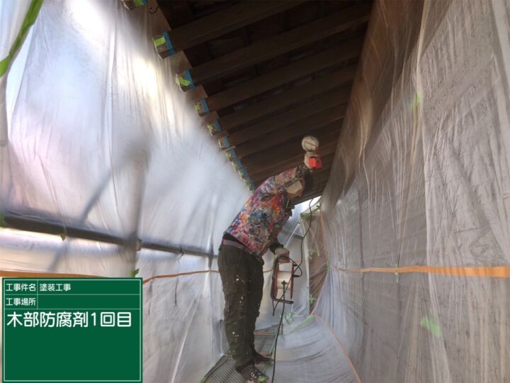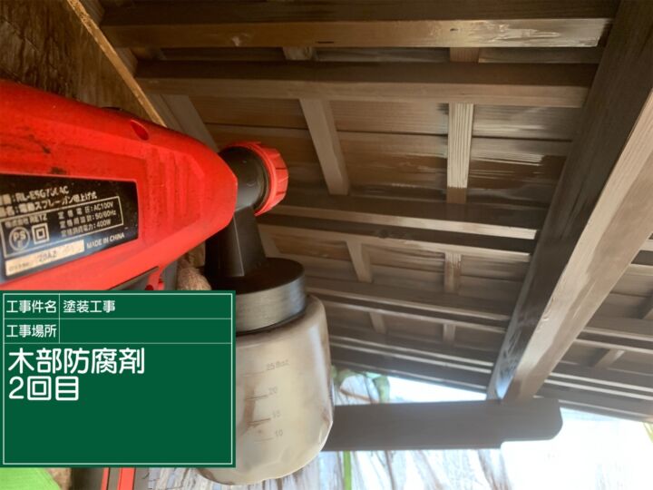 こちらは、吹き付けで施工しました。隅々まで防腐剤が行き渡るように、丁寧に作業していきます。