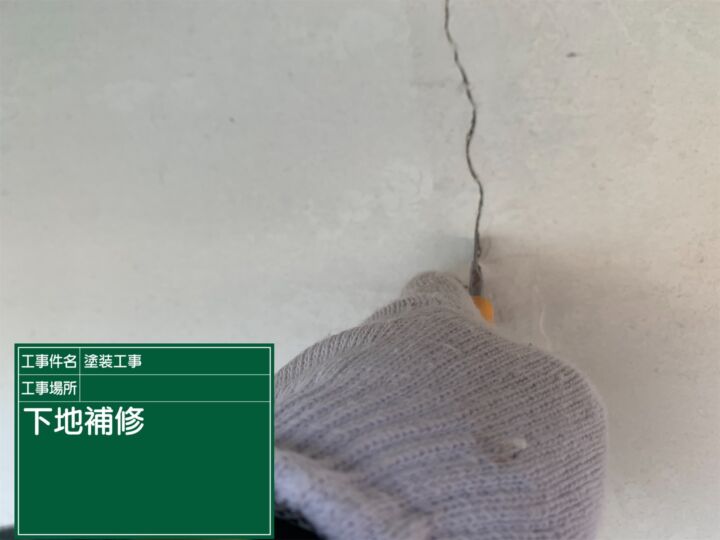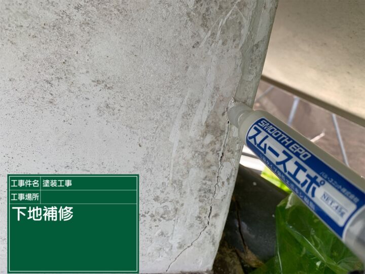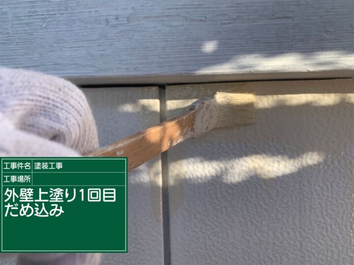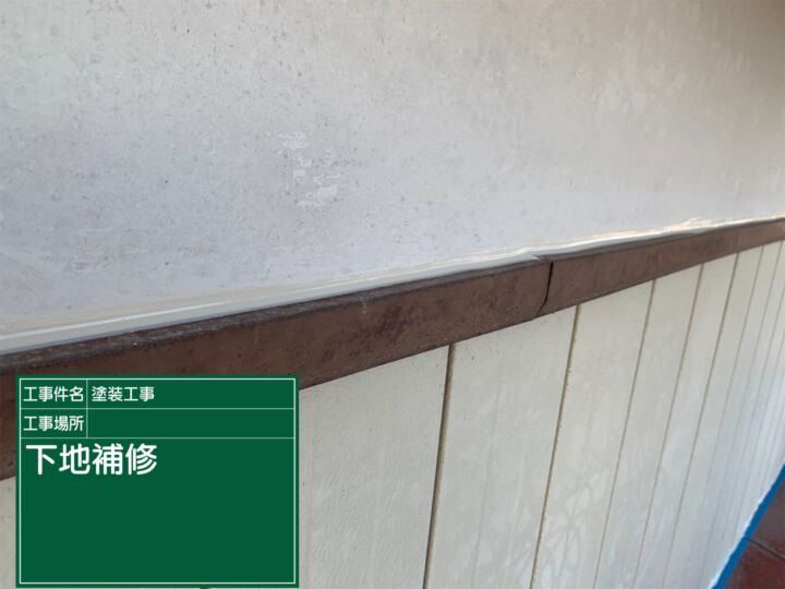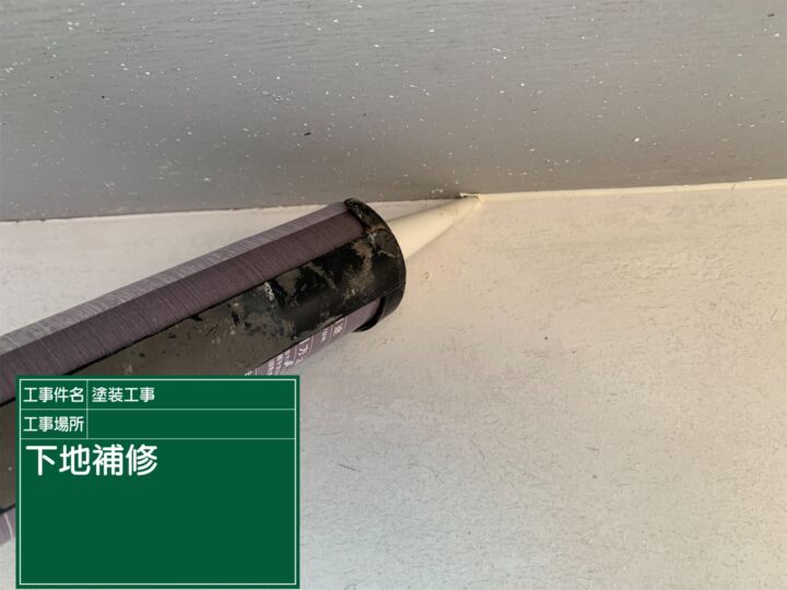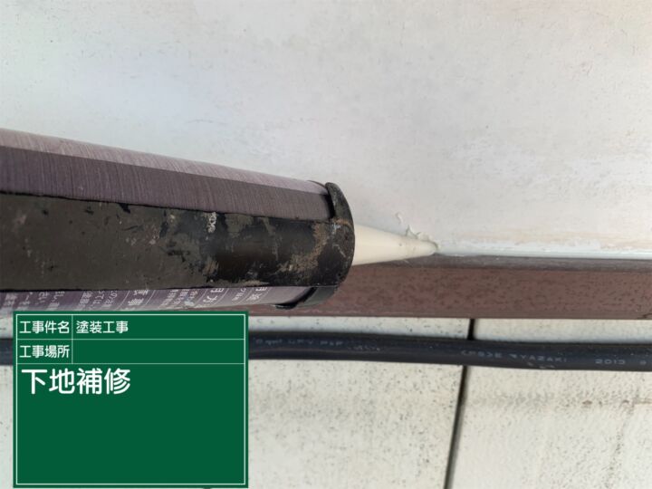 割れていたり傷んでいる箇所がありましたので、塗装前にシーリング材で補修していきます。