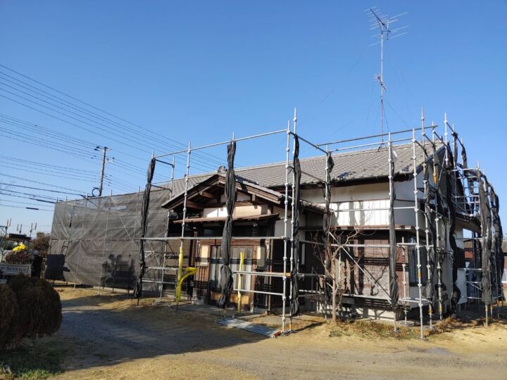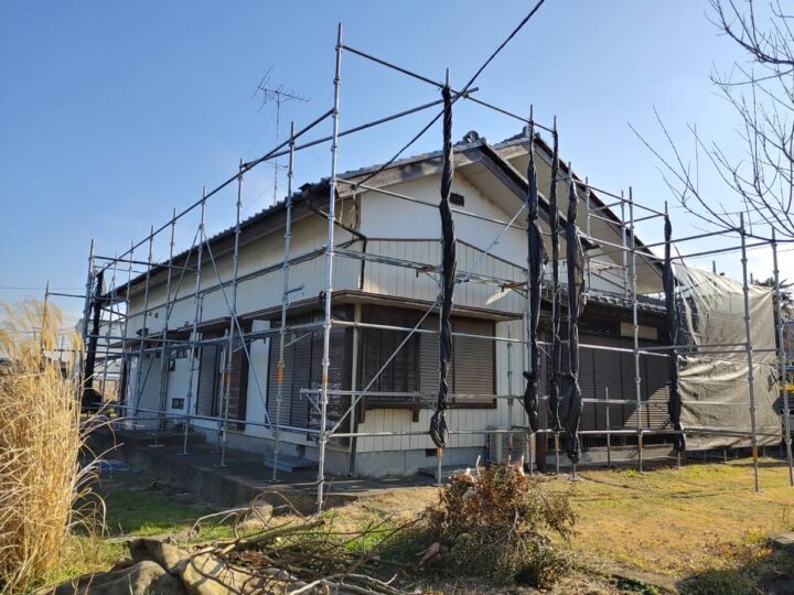 塗装前には必ず足場を設置します。足場があることで足元が安定し、高所での作業も安全に行うことが出来ます。丁寧に施工出来ますので、作業効率も上がります。また、ネットを張ることで洗浄時の水や塗装時の塗料の飛散を防止することも出来ます。強風時には倒壊の危険がありますのでたたみます。