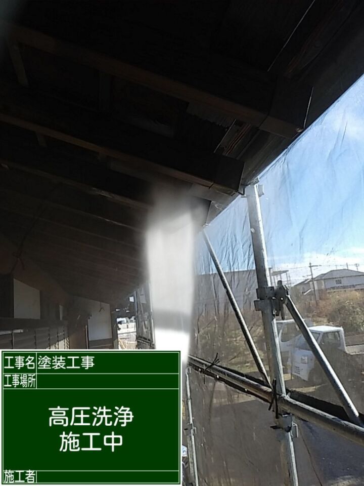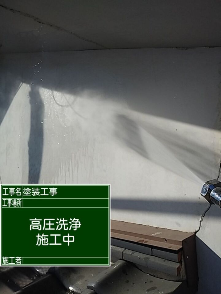 高圧洗浄機を使用して、長年蓄積された汚れやカビ、古い塗膜までをしっかりと洗い流していきます。この作業を怠りますと、新しく塗る塗料の早期剝離に繋がりますので丁寧に作業していきます。