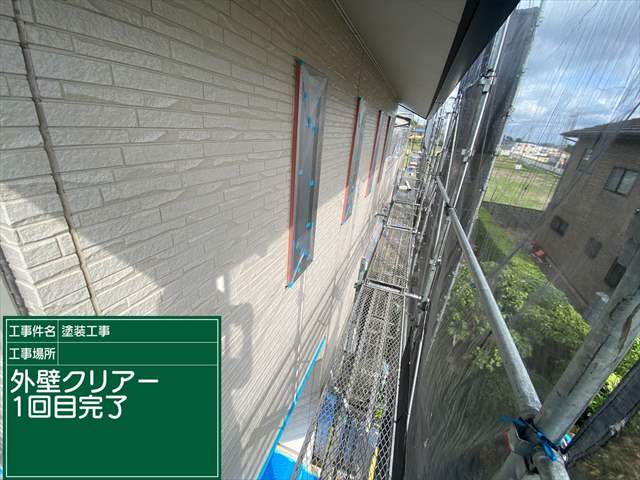石岡市でおこなった窯業系サイディング外壁のクリヤ塗装、1回目です。