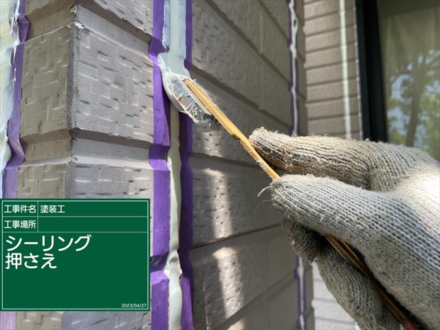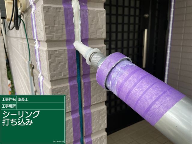 プライマーはオープンタイムを守って、接着性があるうちにシーリングを打ち込んでいきます。