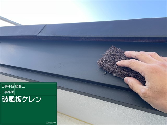屋根を守る破風板の塗装です。はじめにケレン作業をおこないます。