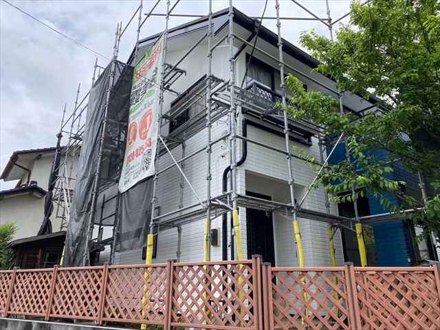 施工前に近隣の方にご挨拶をおこない、足場を設置します。