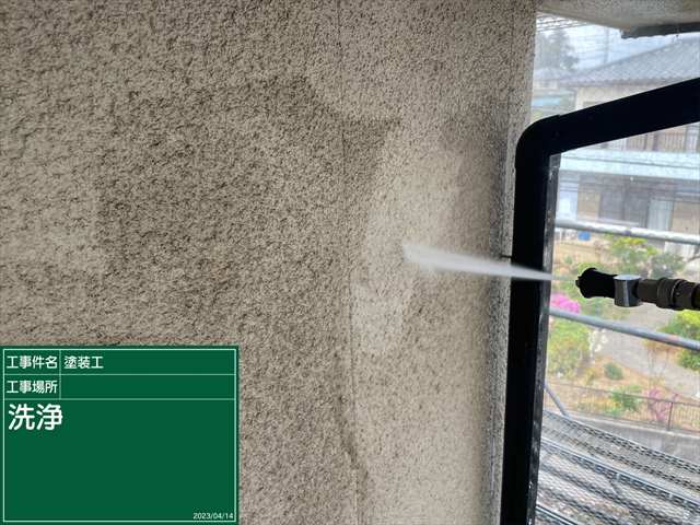 石岡市の外壁塗装現場、まずは洗浄をおこないます。