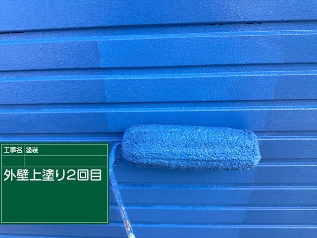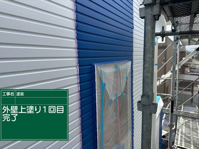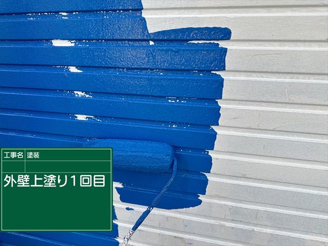石岡市の外壁塗装現場、青色おこなう上塗り1回目の塗装です。